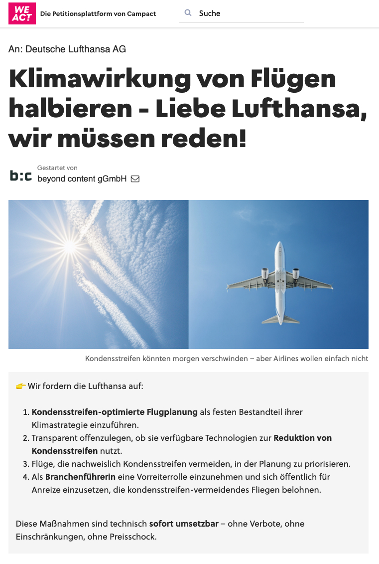 Was wir fordern: Wir starten eine Petition. An euch, liebe Lufthansa. Nicht weil wir euch hassen, sondern weil ihr Europas größte Airline seid. Wenn ihr vorangeht, ziehen andere nach. Also: Führt kondensstreifen-optimierte Flugplanung ein! Sagt offen, ob ihr die verfügbare Technologie nutzt! Priorisiert Flüge, die Kondensstreifen vermeiden! Und setzt euch für Anreize ein, die solches Fliegen belohnen! Das ist keine Öko-Utopie. Das ist eine Frage des Willens. Die Technik ist da. Die Lösung liegt auf dem Tisch. Ihr müsst sie nur aufheben.